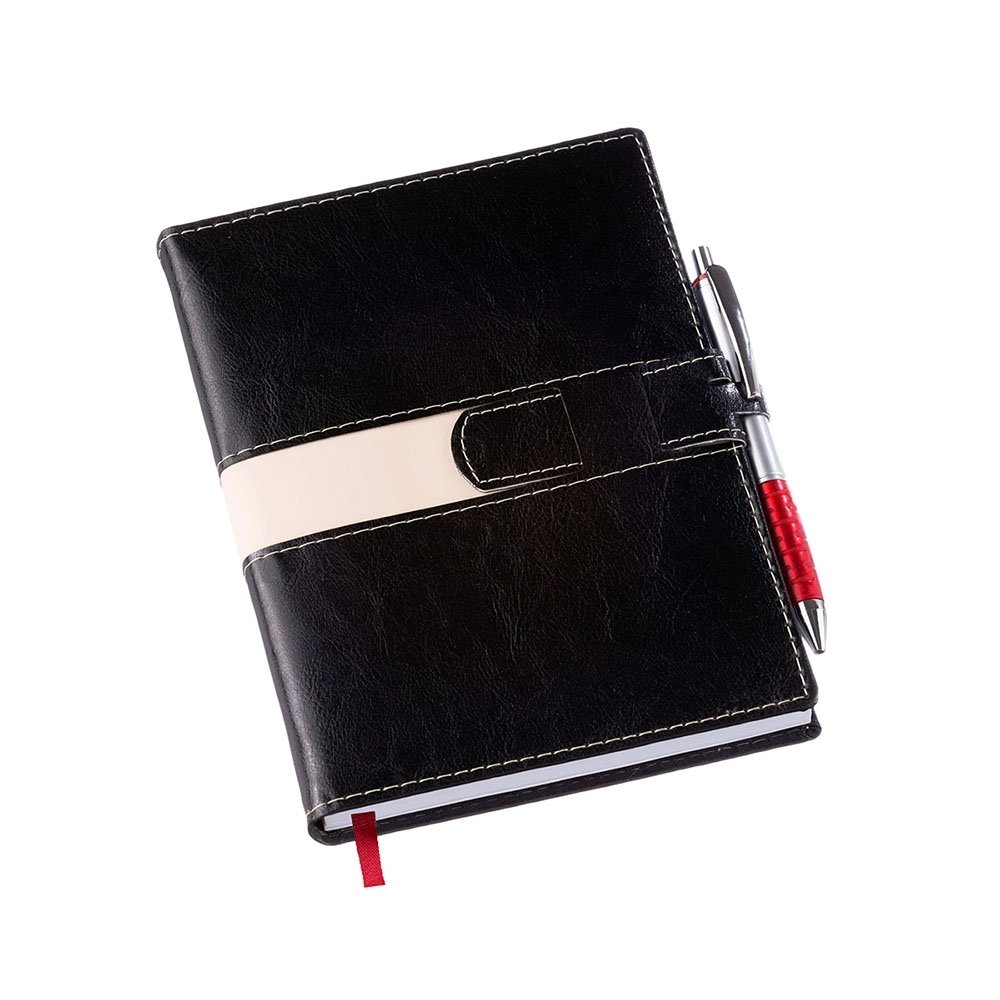 Agenda diária 2023 de couro sintético com fecho e suporte para caneta.