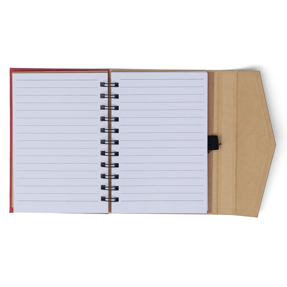 Descrição: Bloco de anotações ecológico com autoadesivos e suporte para caneta. Bloco de capa colorida com abertura lateral imantada, primeira folha com cinco blocos autoadesivos coloridos com aproximadamente 25 folhas e aproximadamente 68 folhas brancas pautadas. Ultima página kraft conta com suporte para caneta em nylon(não acompanha caneta).