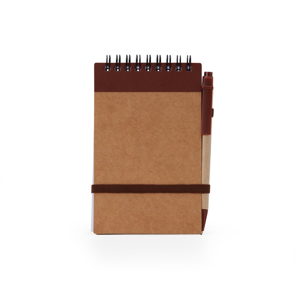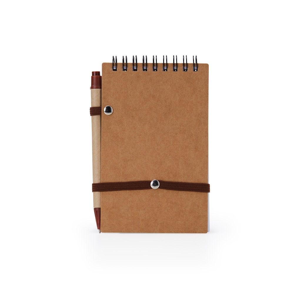 Descrição: Bloco de anotações ecológico com caneta, feito em kraft com detalhe plástico. Contém aproximadamente 70 folhas brancas com pauta, porta caneta elástico, elástico para lacre e acompanha caneta de papelão com detalhes plásticos, carga esferográfica azul 1.0mm e acionamento por clique.
