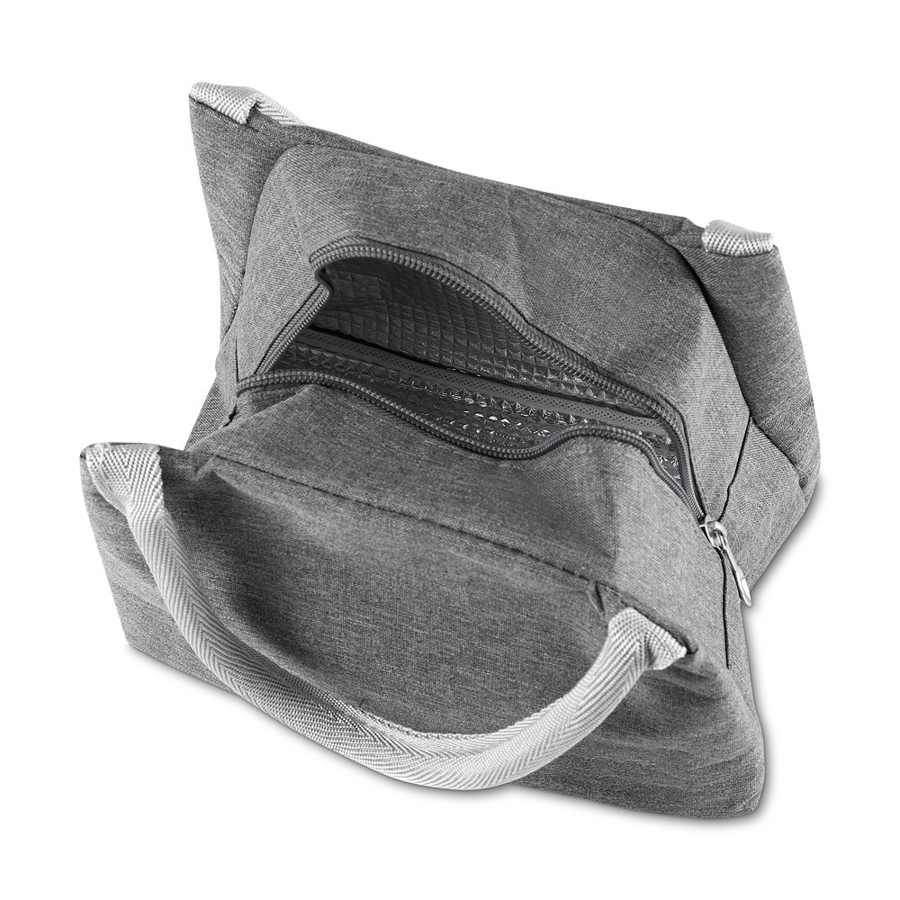 Bolsa térmica com alça de mão, confeccionada em poliéster 300D na parte externa e alumínio com manta térmica no interior. Modelo costurado, puxador de zíper em formato de colher, sem solda e capacidade para 5,6 litros.