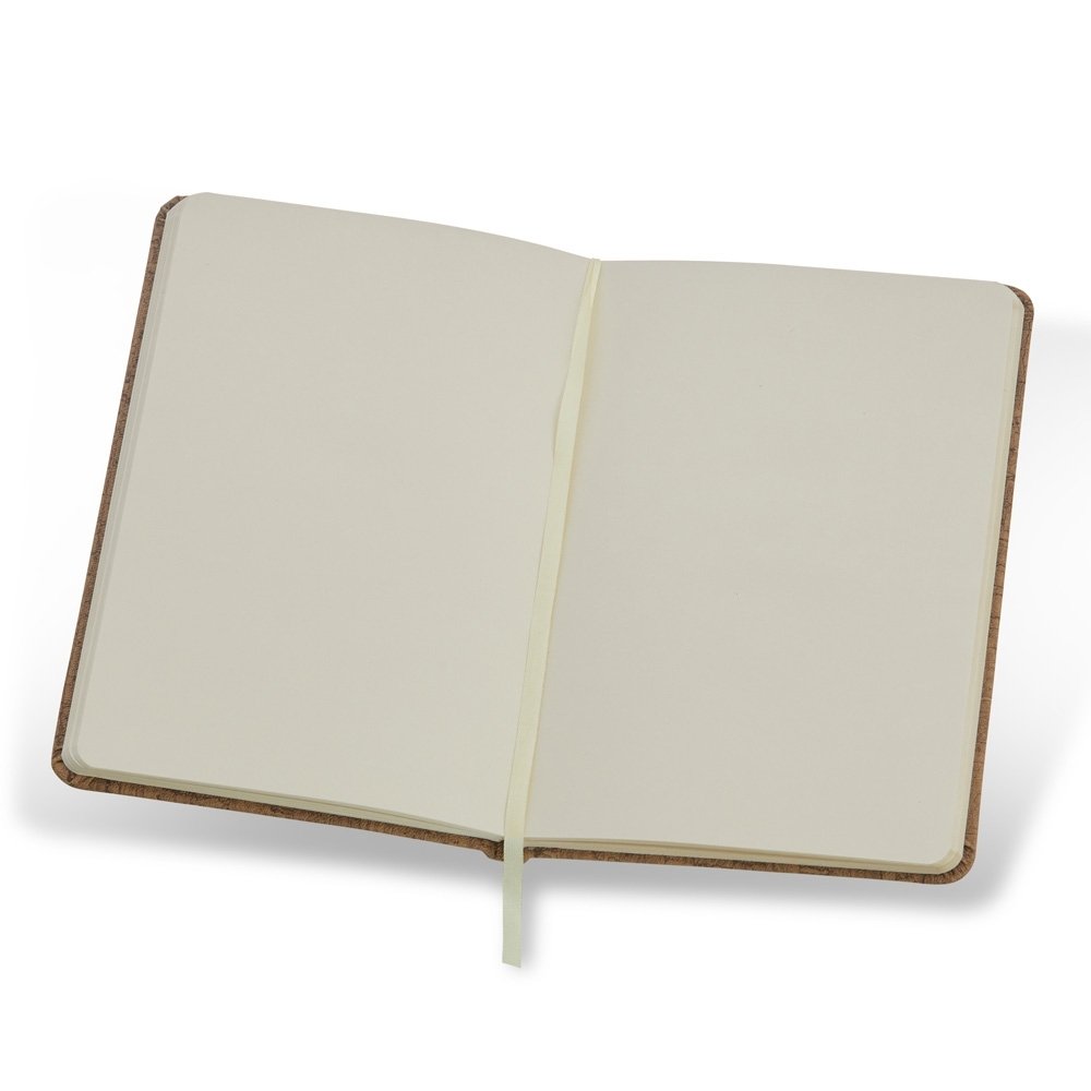 Descrição: Caderneta em cortiça, possui marca página em cetim e elástico para lacre. Contém aproximadamente 80 folhas marfim sem pauta.