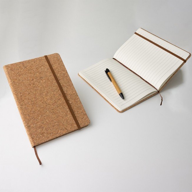 Descrição: Caderneta de cortiça, contém aproximadamente 80 folhas amarelas com pauta, marcador de página em cetim e elástico para lacre.
