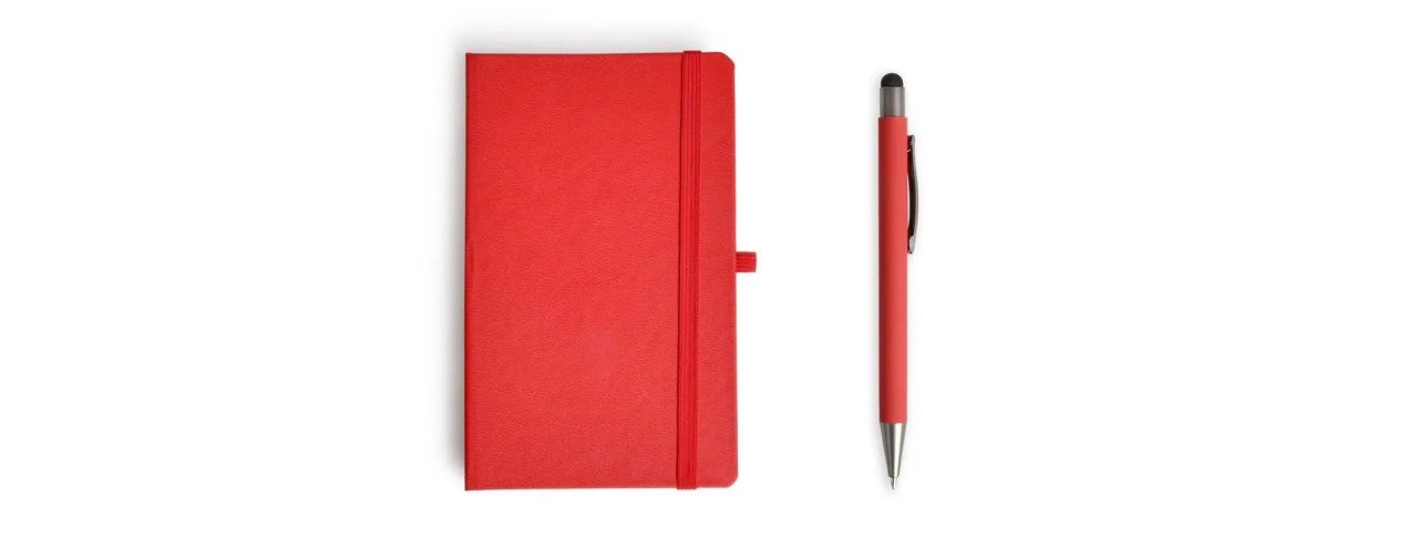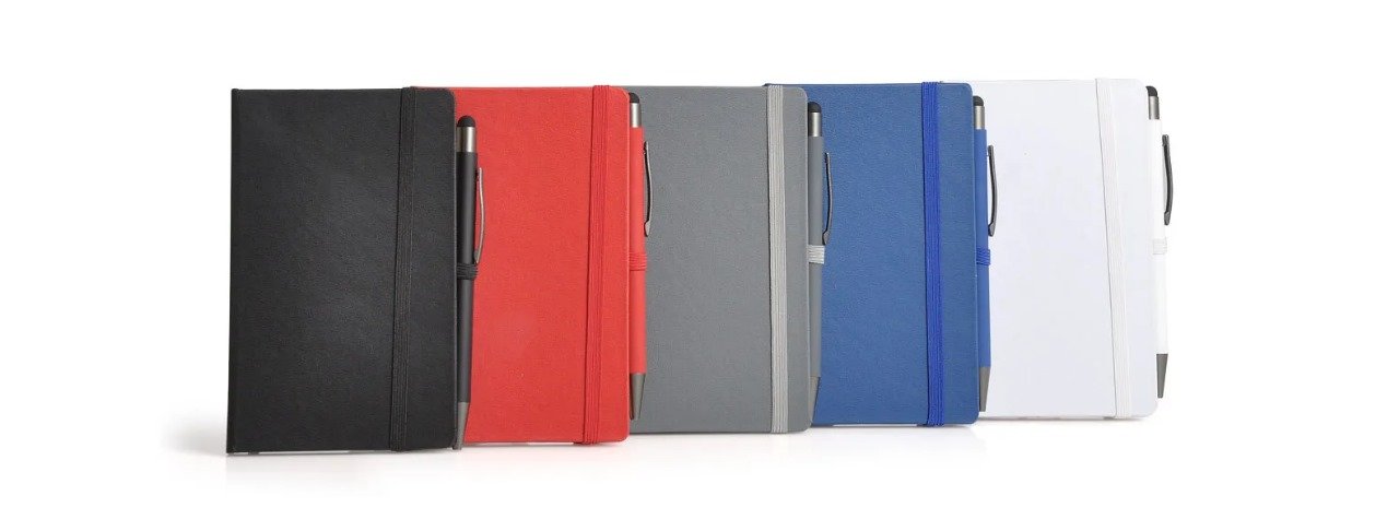 Caderneta para anotações com caneta. A caderneta conta com 80 folhas não pautadas, suporte para caneta e elástico para fechamento. Caneta esferográfica em Alumínio. Conta com acabamento fosco, clipe e ponteira touch em silicone preto. Carga esferográfica azul acionada por um click na extremidade da caneta.