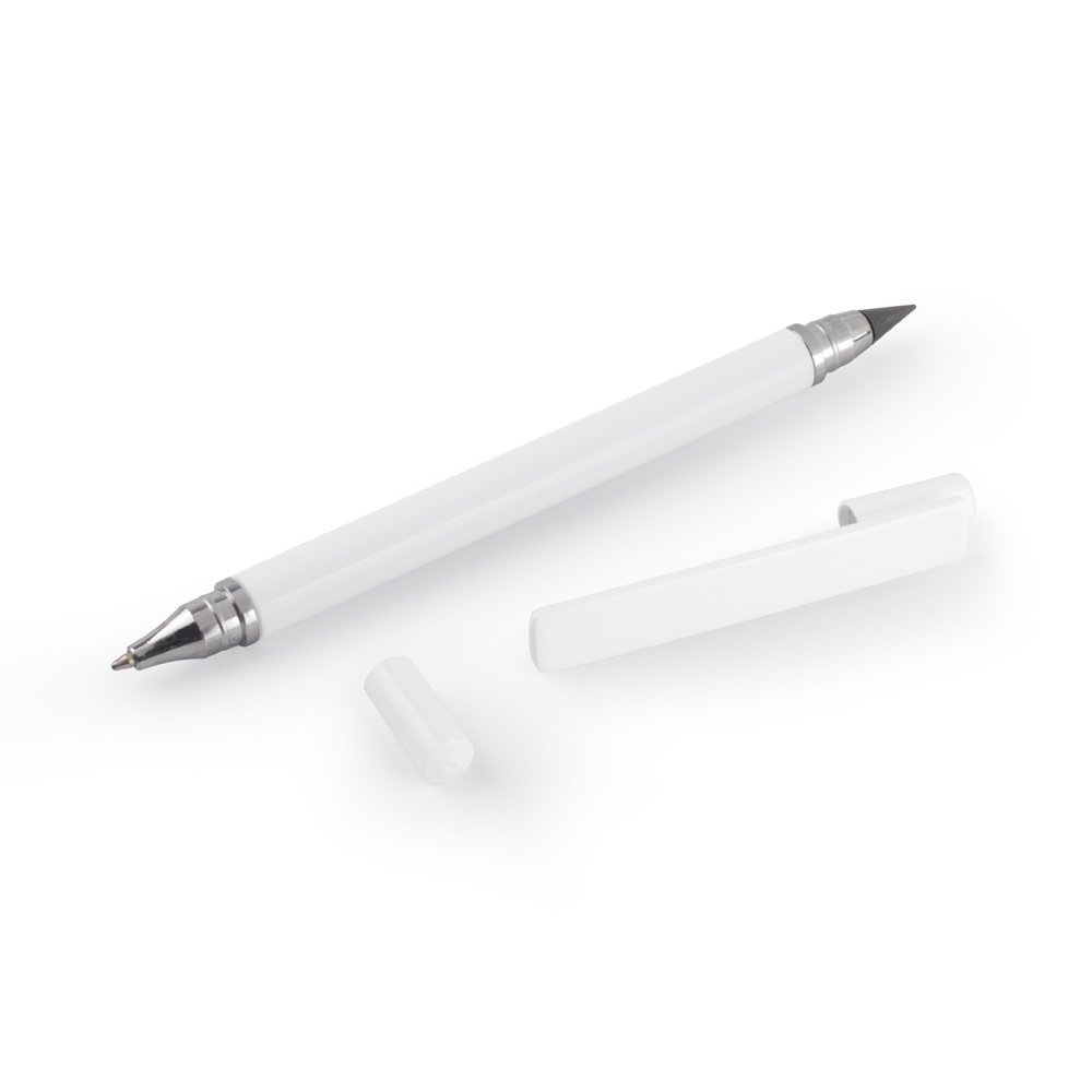 Acompanha caneta/lápis infinito (ponta dupla) feito em corpo plástico.