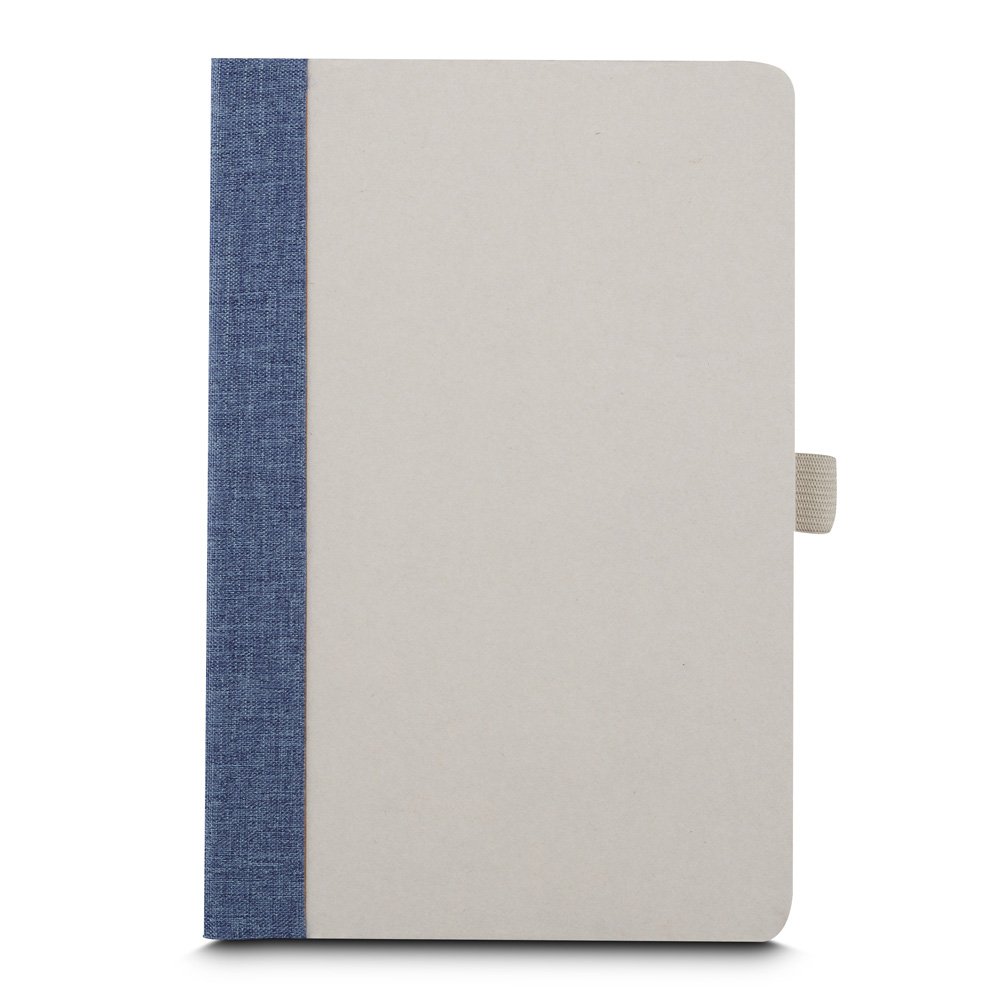 Caderno de anotações, Capa produzida/de fibra de cana de açucar e tecido RPET com suporte para caneta, miolo com 80 folhas pautadas na cor bege.