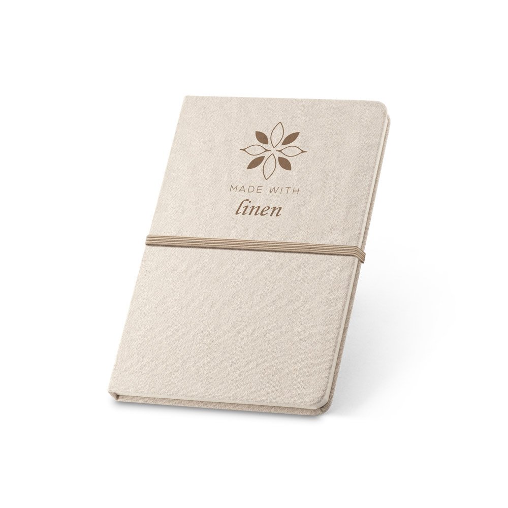 Caderno capa dura em linho com 96 folhas. Cantos arredondados. Caneta não inclusa.