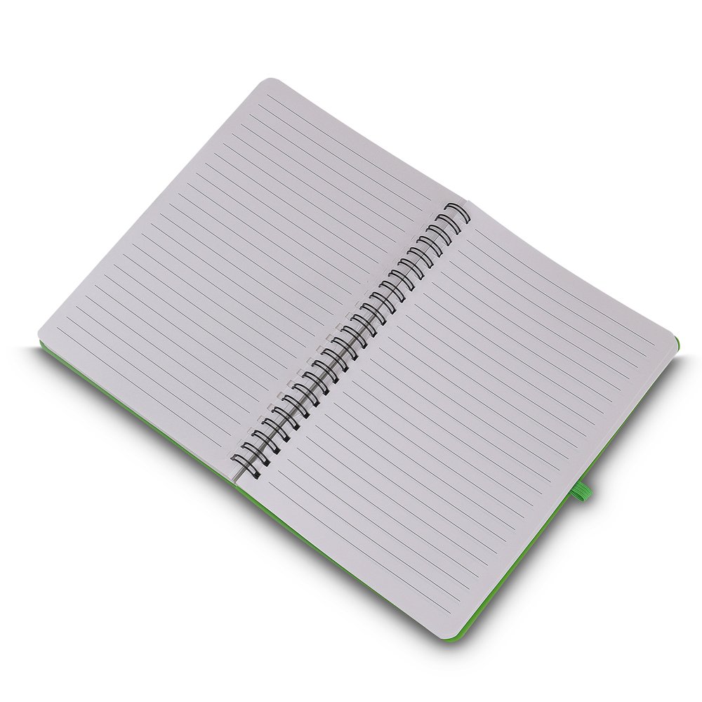 Caderno de anotações em PP reciclável com suporte para caneta e miolo de 70 folhas brancas pautadas.