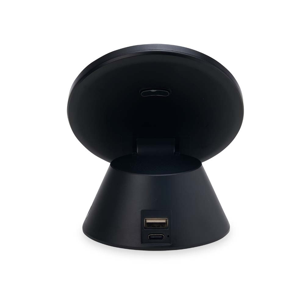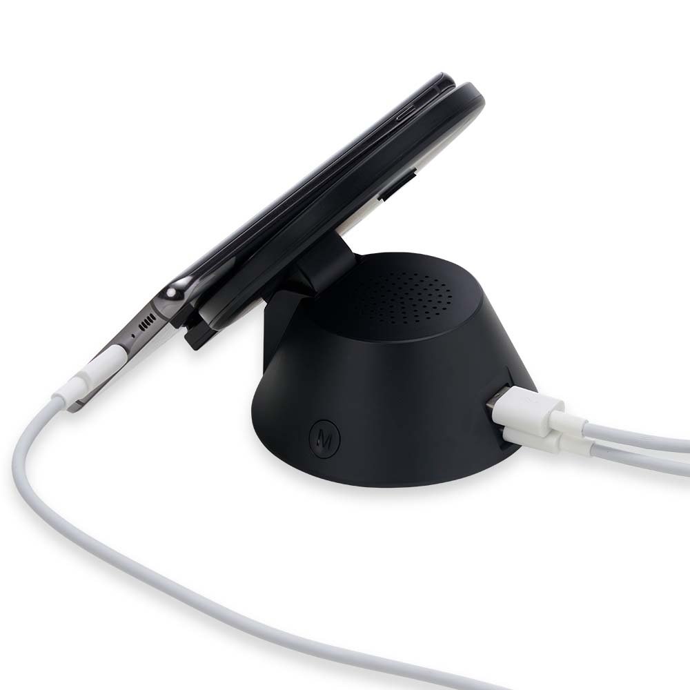 Descrição: Caixinha de Som bluetooth com carregador por indução. Produzido em material plástico, a caixinha possui antiderrapantes emborrachados na parte inferior, ao ser inclinado o produto também pode ser utilizado como suporte para o celular. Para desfrutar do carregamento por indução (sem fio) é fundamental que o celular possua a tecnologia QI – desta maneira é possível carregar o celular posicionando-o sob carregador, sendo necessário apenas conectar o carregador à uma fonte de energia (USB ou diretamente na tomada). Acompanha cabo USB Tipo-C.