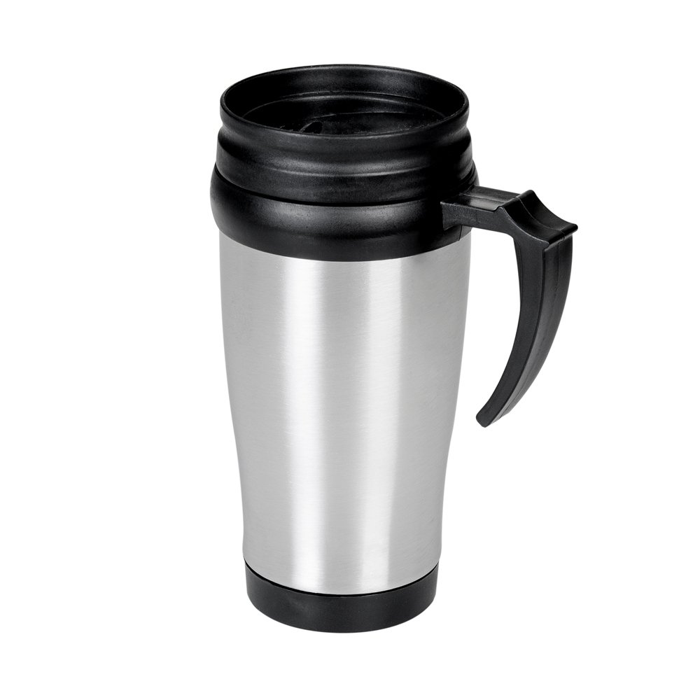 Caneca inox de 400ml revestida internamente com PVC, pegador e detalhes em plástico resistente. Tampa rosqueável, possui compartimento que pode ser aberto para beber(não é térmica).
