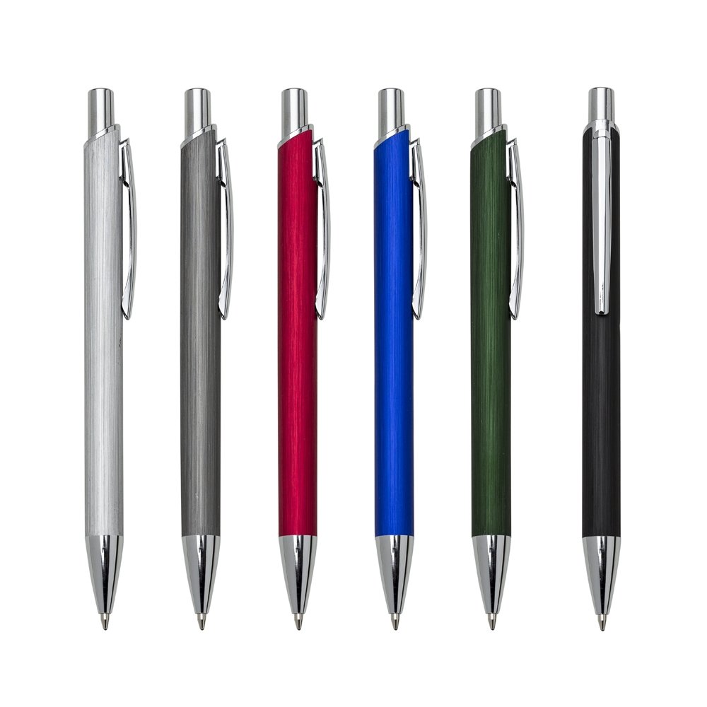 Caneta alumínio inteira colorida com detalhes prata, pintura tipo escovada. Clip metal, acionador e ponteira prata. Aciona por clique.