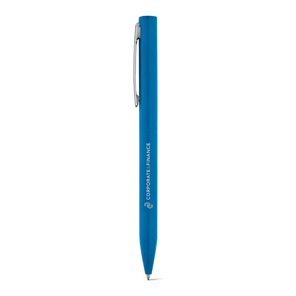 Esferográfica: em alumínio com mecanismo twist. Clipe em ferro com cromagem brilhante. Corpo laqueado com acabamento brilhante. Recarga em metal “tipo-Cross”.