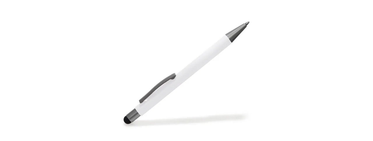 Caneta esferográfica em alumínio branca. Conta com acabamento fosco, clipe e ponteira touch em silicone preto. Carga esferográfica azul acionada por um click na extremidade da caneta.