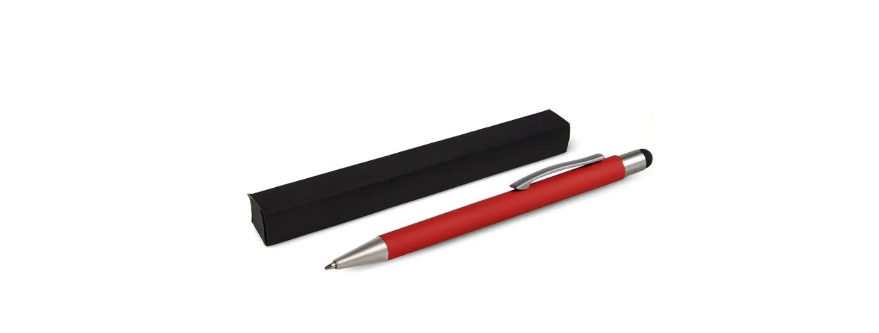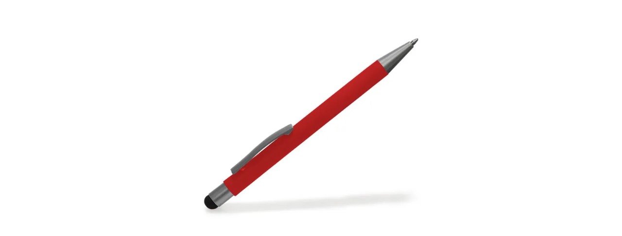 Caneta esferográfica em alumínio vermelha. Conta com acabamento fosco, clipe e ponteira touch em silicone preto. Carga esferográfica azul acionada por um click na extremidade da caneta.