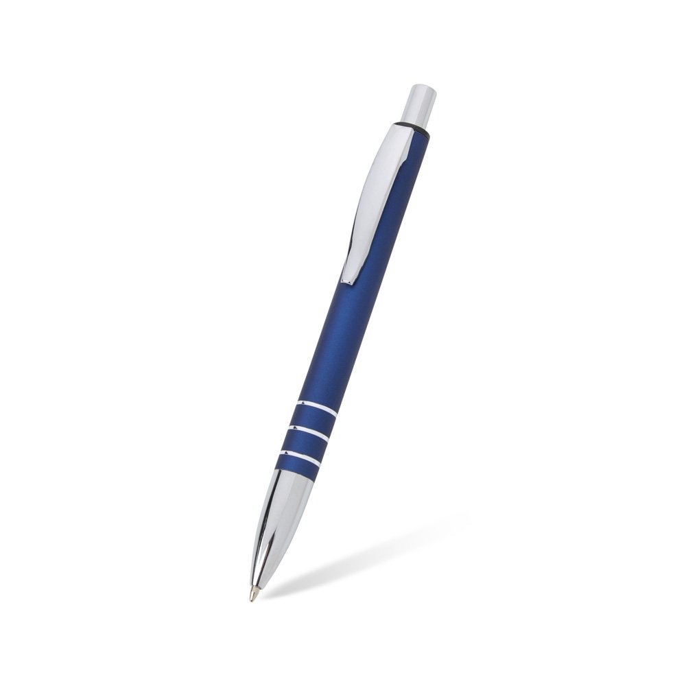 Descrição: Caneta metálica com acabamento fosco, clipe metálico e ponteira plástica. Carga esferográfica azul 1.0mm e acionamento por clique.