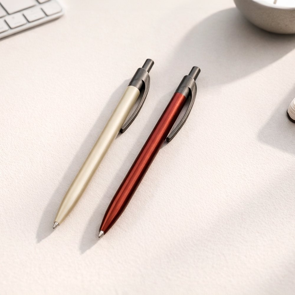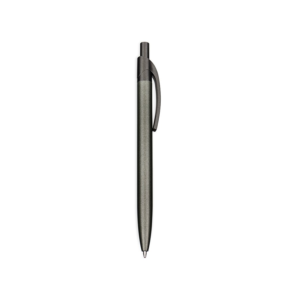 Descrição: Caneta metálica com acionamento por clique e clip em plástico. Possui carga esferográfica azul de 1,0mm.