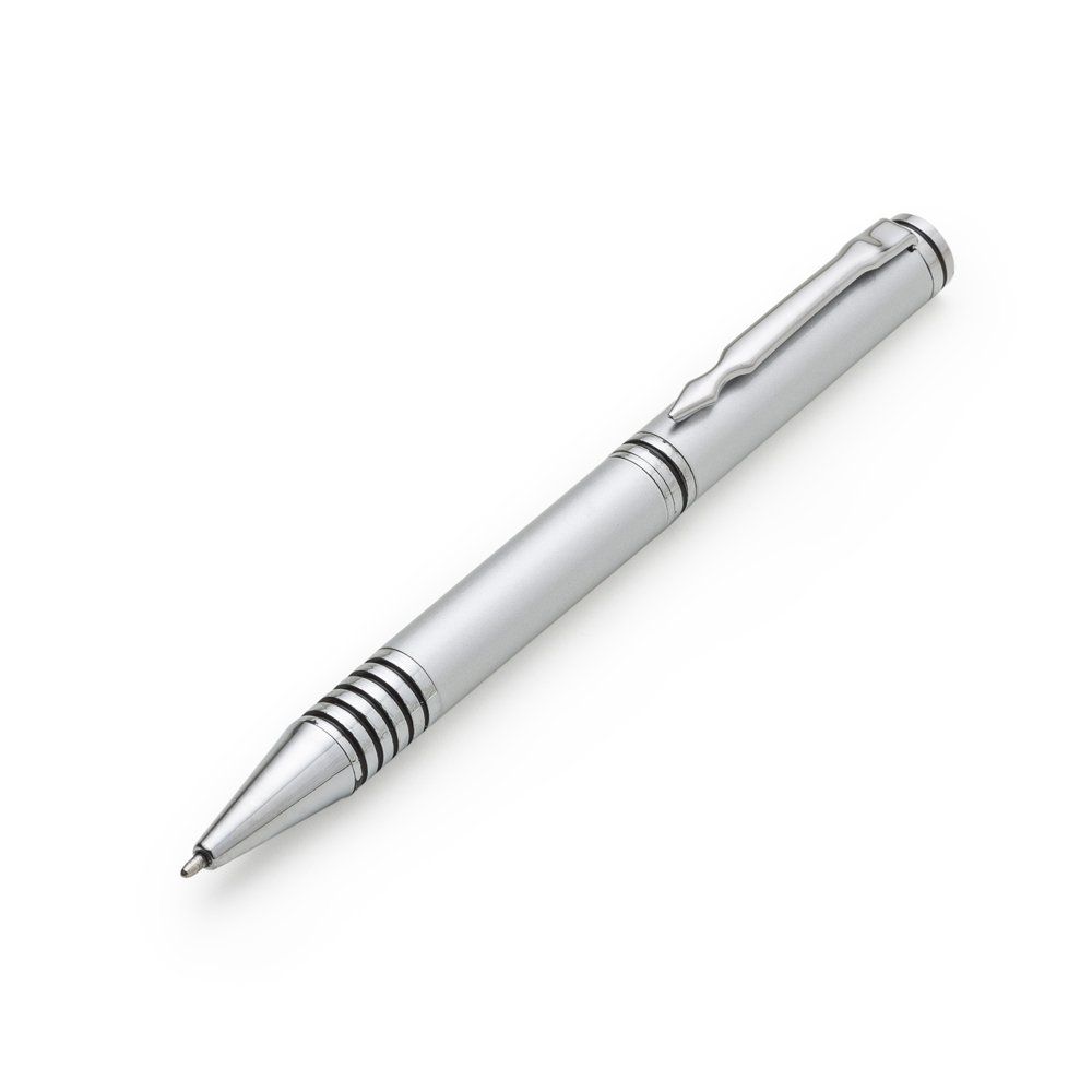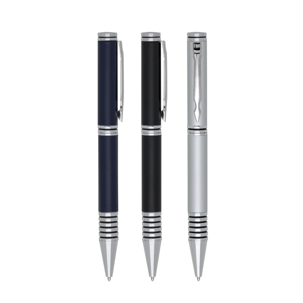 Caneta metal: Inteira colorida com detalhes prata. Clip metal, possui anel preto em relevo na parte superior e no centro. Seis anéis prata na parte inferior com um detalhe preto. Aciona por giro.