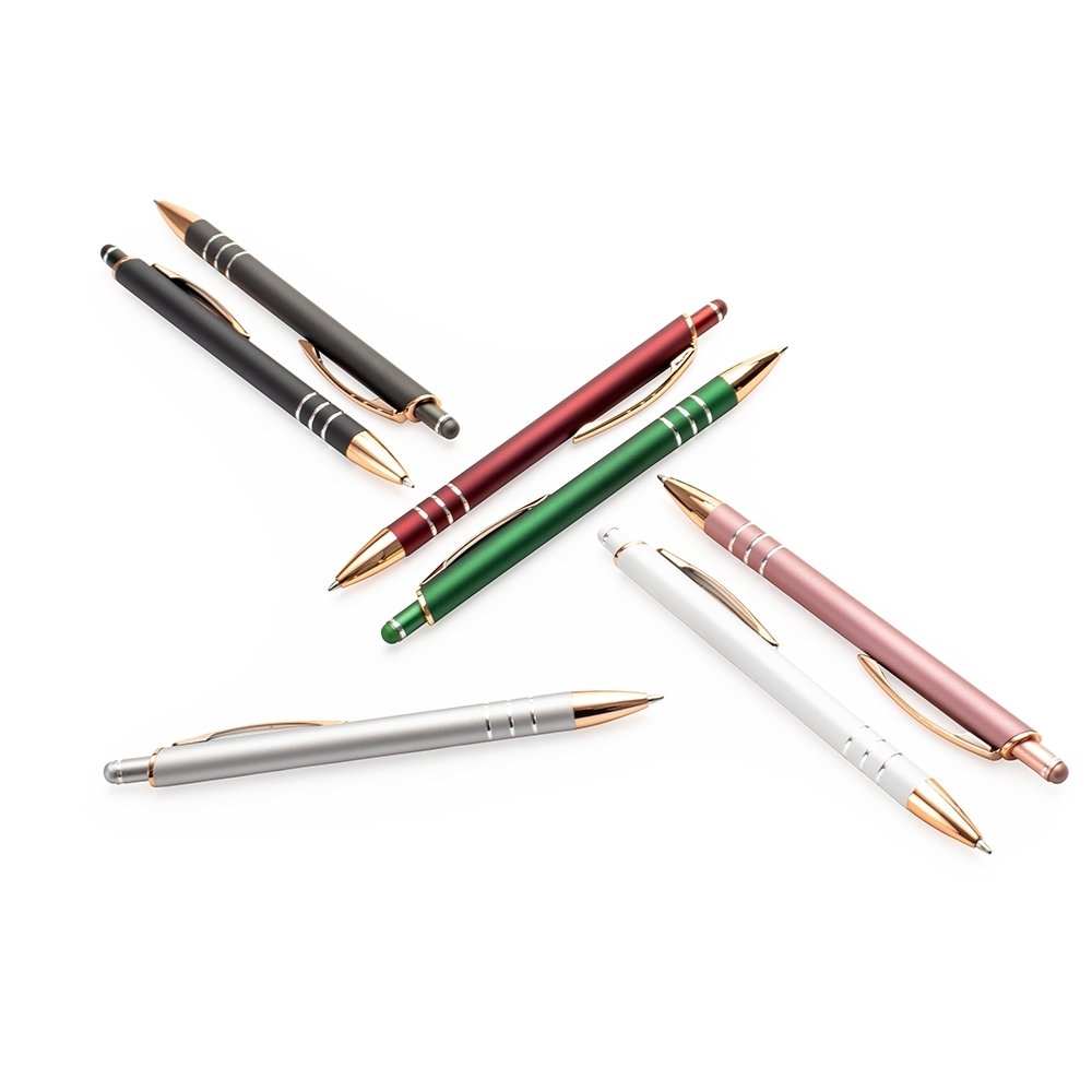 Descrição: Caneta metálica com carga esferográfica de 1,0mm e acionamento por clique de revestimento emborrachado, ideal para interagir com telas sensíveis ao toque.