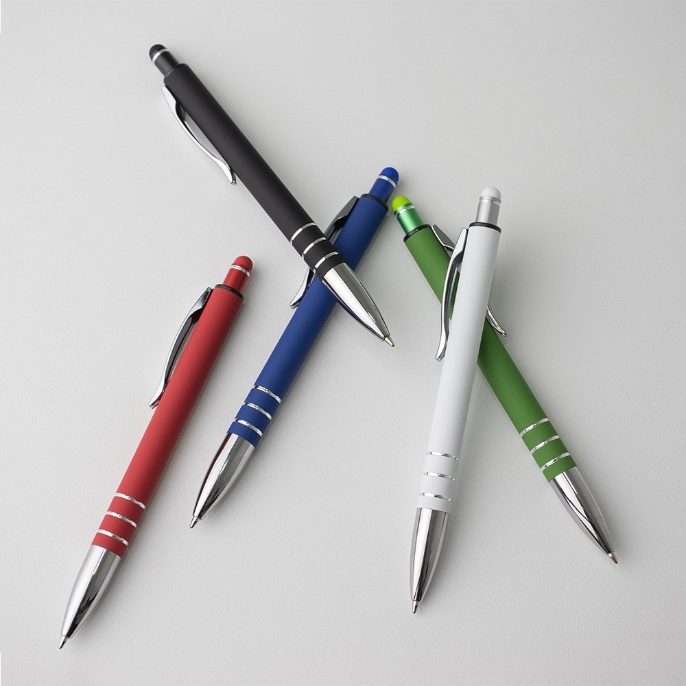 Descrição: Caneta metálica touchscreen com acabamento emborrachado, acionamento por clique e carga esferográfica azul 1.0mm.