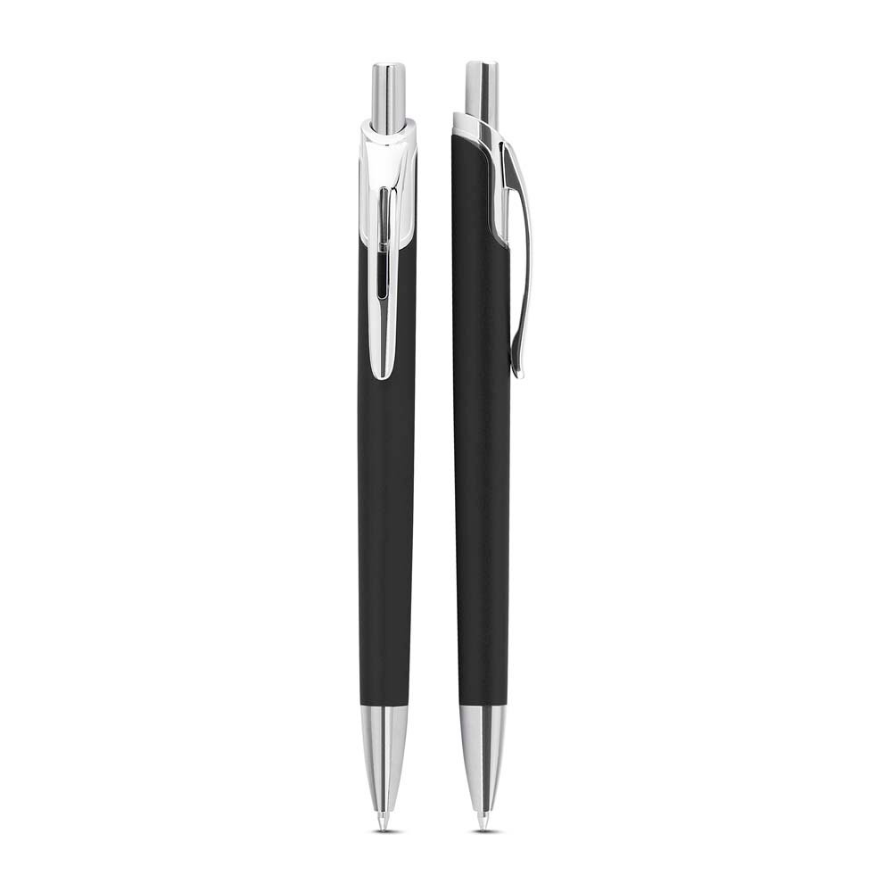 Caneta com corpo em alumínio reciclado, acionador e clipe cromado, escrita esferográfica em azul.
