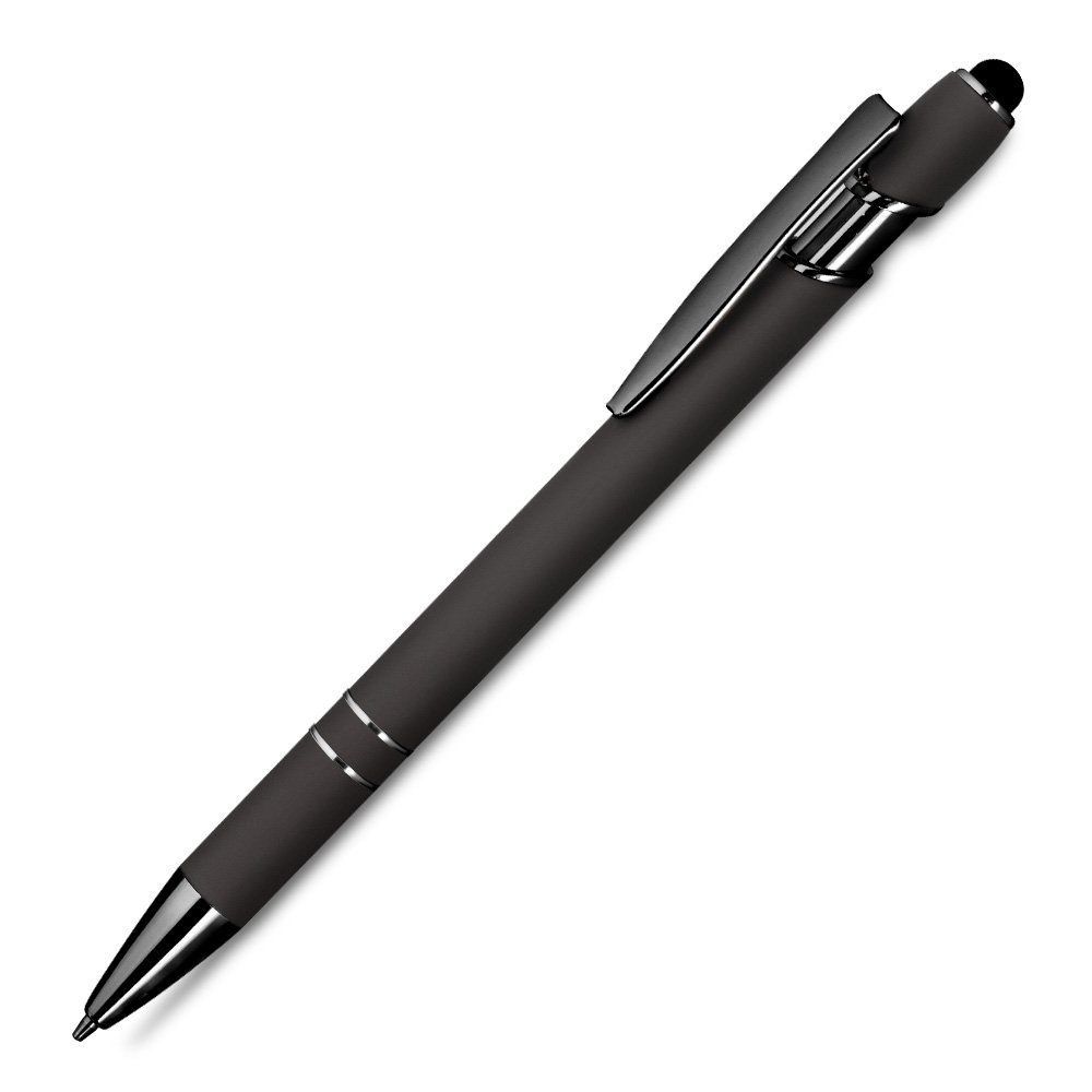 Caneta esferográfica em metal escrita em azul. Refil tipo parker com ponta touch emborrachada.