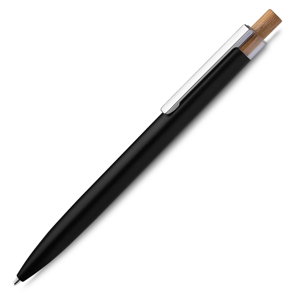 Caneta esferográfica em alumínio reciclável com escrita em azul. Refil parker e acionador em bambu.