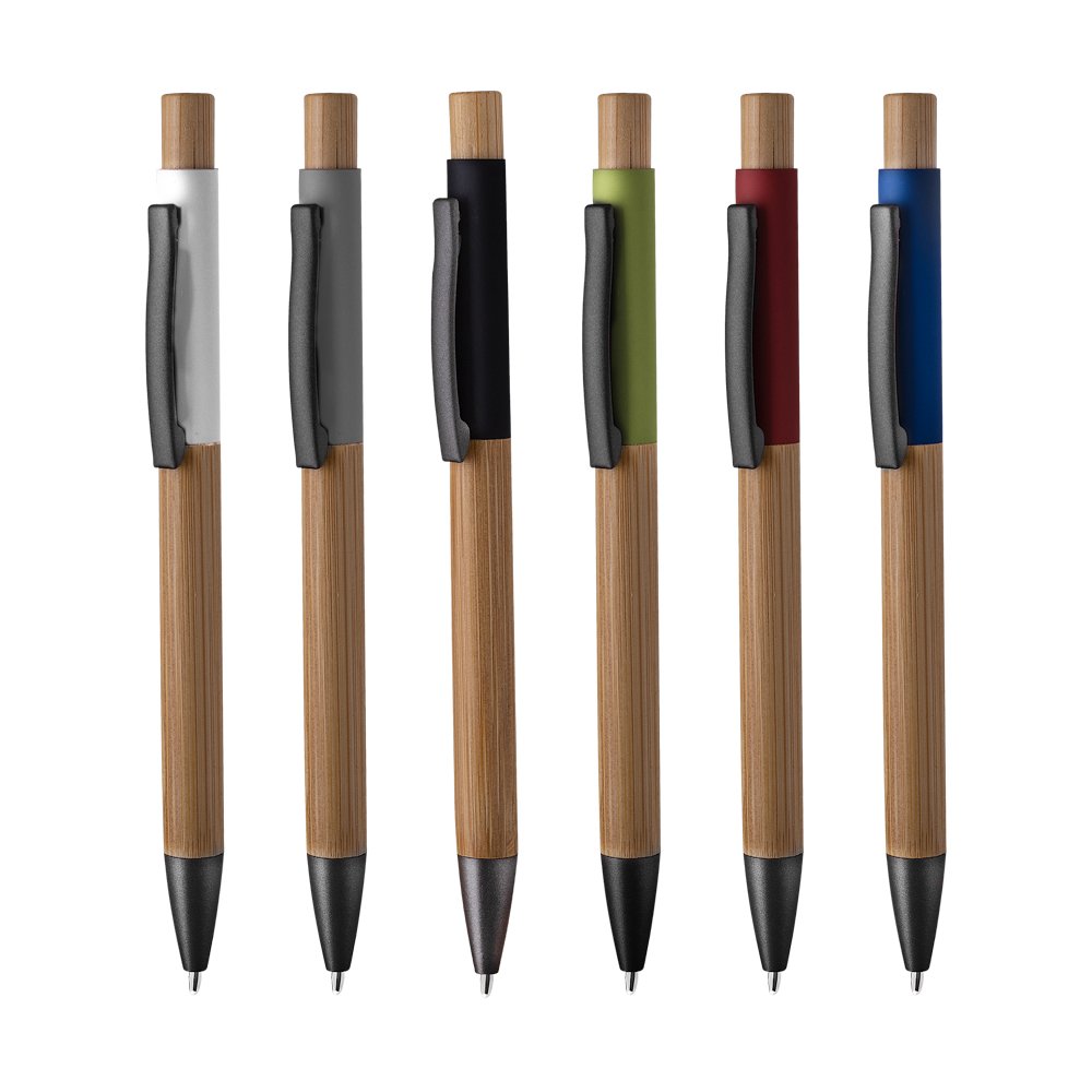 Caneta esferográfica em alumínio reciclável com escrita em azul. Refil parker e acionador e corpo em bambu.