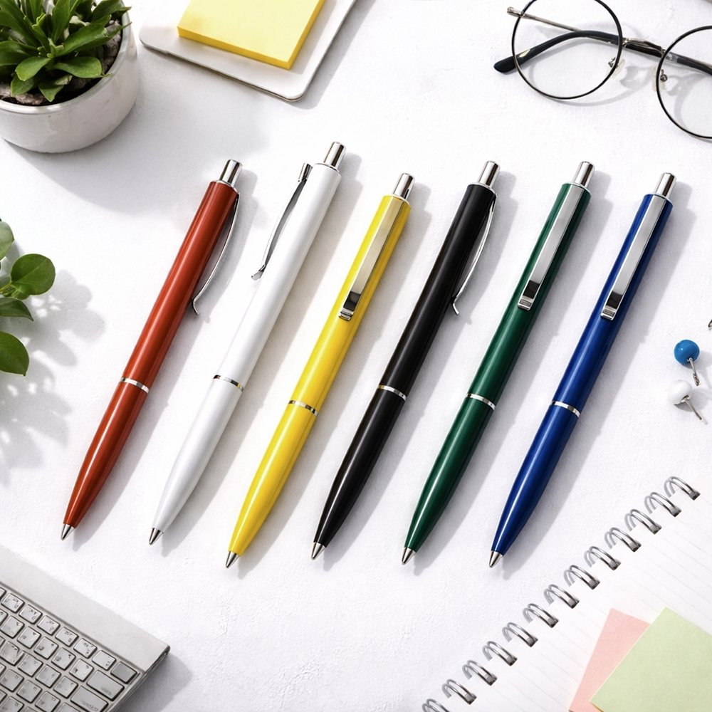 Descrição: Caneta plástica com clip e ponteira em metal. Possui acionamento por clique e carga esferográfica azul de 1.0mm.
