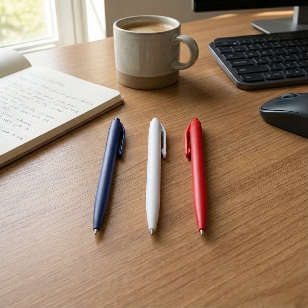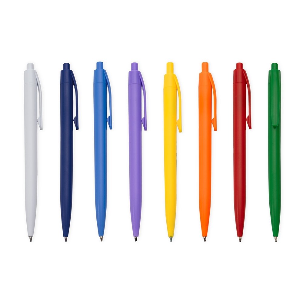 Descrição: Caneta feita inteiramente em plástico. Conta com acionamento em por clique e carga esferográfica azul de 1.0mm.