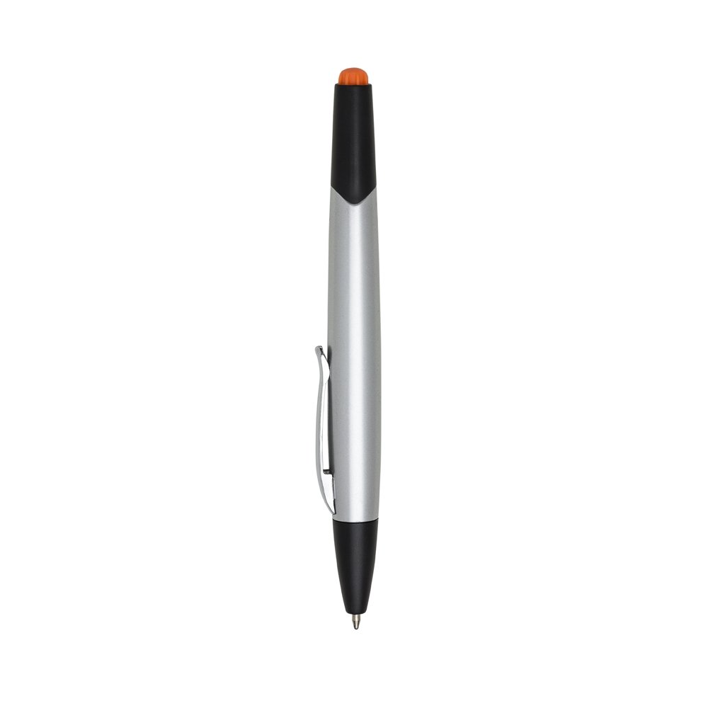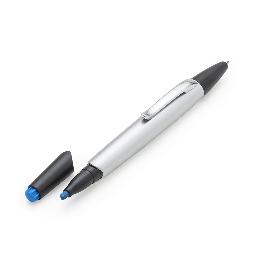 Caneta plástica com marca texto inteira prata com detalhes preto. Clip de metal, para utilizar marca texto basta puxar a tampa preta aonde possui um detalhe colorido sinalizando o marca texto e do outro lado esferográfica aciona por giro.