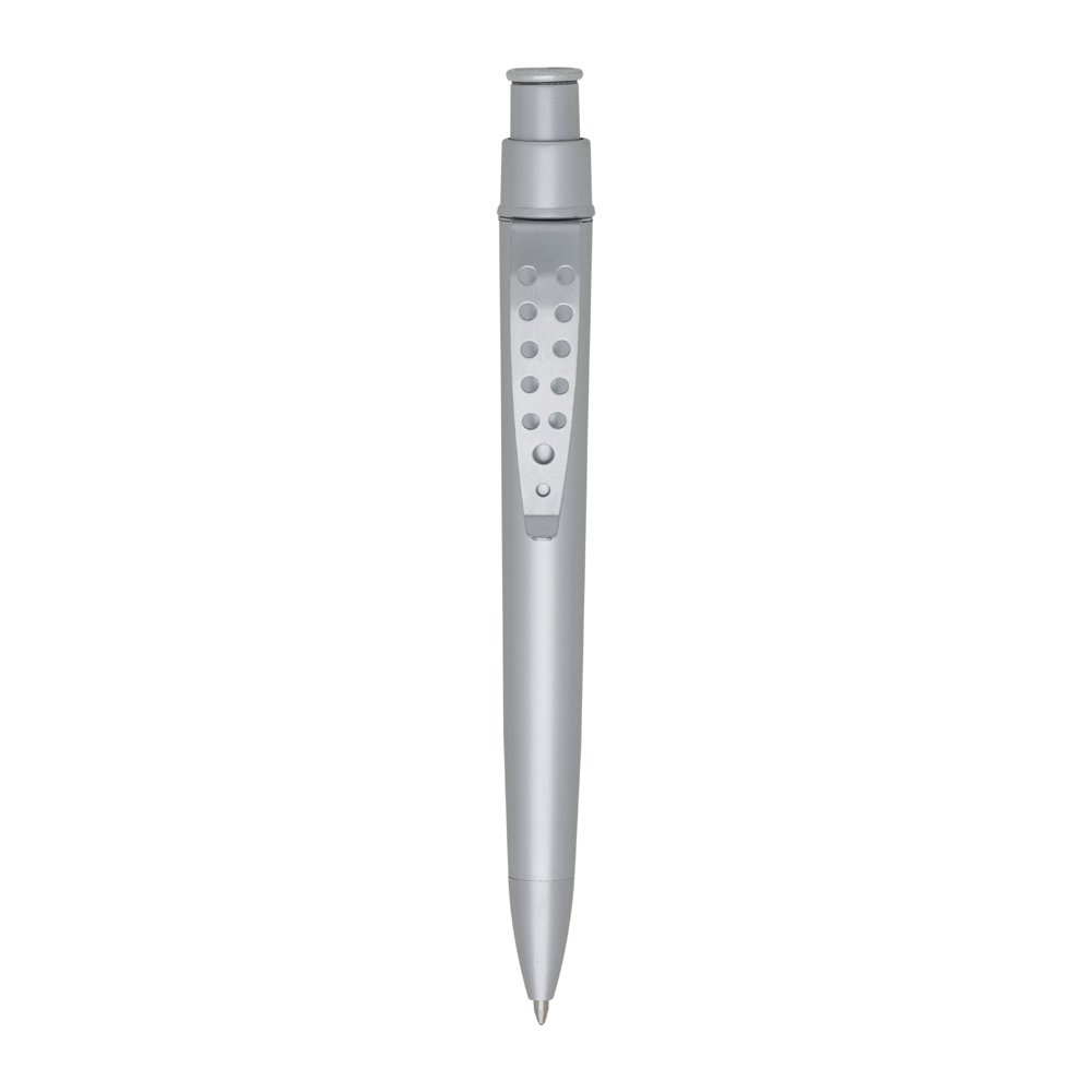 Caneta plástica fosca inteira colorida com detalhes prata. Clip de metal com doze furos, aciona por clique.