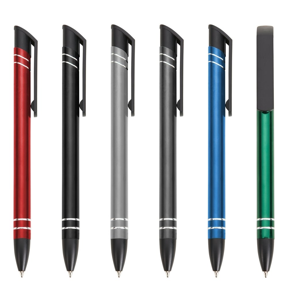 Caneta semimetal: colorida com detalhes em prata. Clip metálico e parte superior com borracha touch, possui anel superior e central em prata. Aciona por giro.