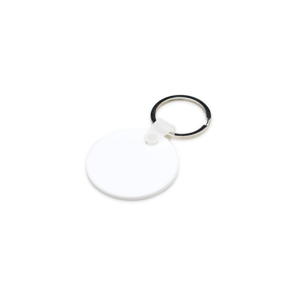 Descrição: Chaveiro de acrílico em formato redondo, frente verso e liso. Possui prendedor de plástico que conecta a argola metálica.