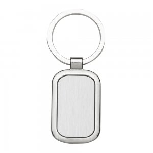 Chaveiro de metal: Retangular com bordas arredondadas, possui chapa frontal em metal e verso liso.