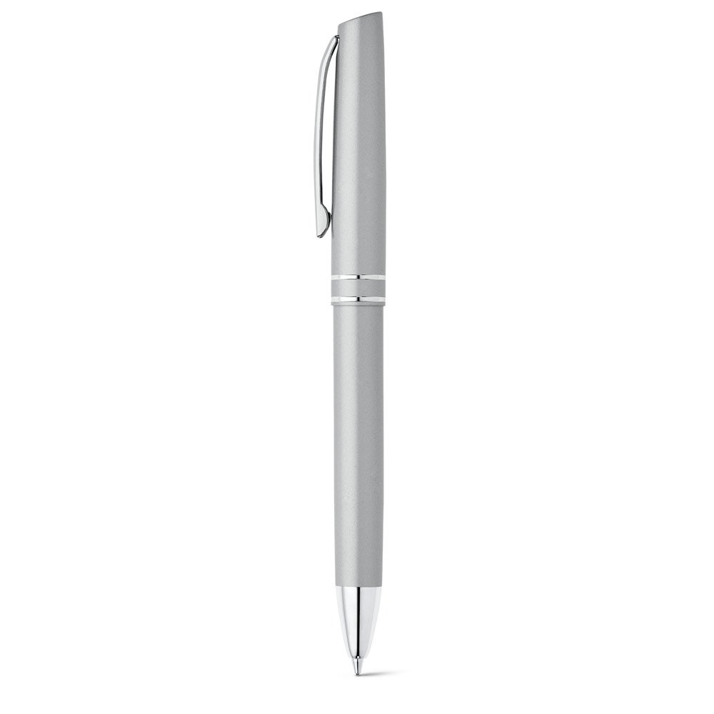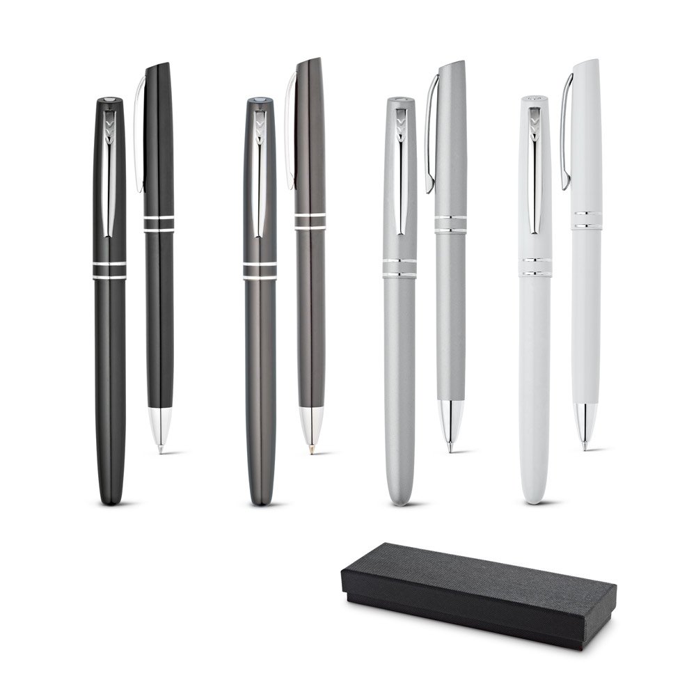Conjunto de roller e esferográfica em alumínio com clipe. Esferográfica até 1,5 km de escrita.