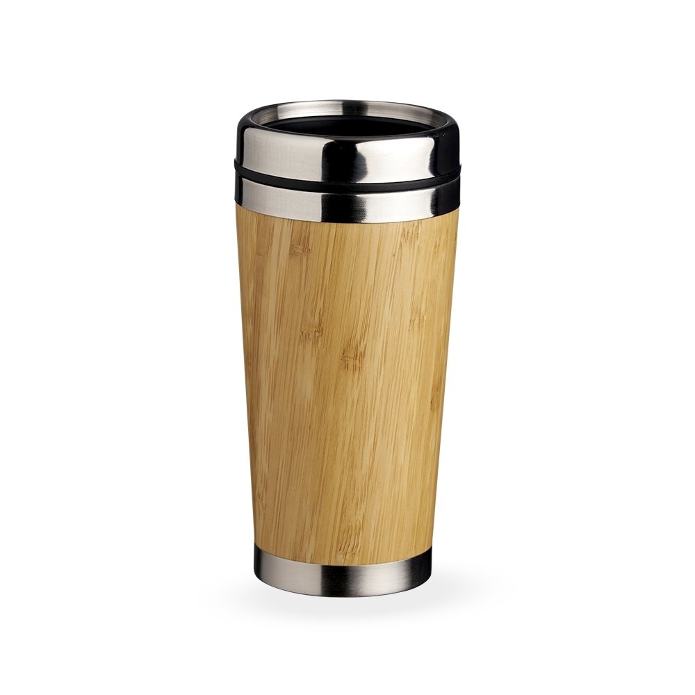 Copo Bambu de 500ml, parte interna em inox. Possui tampa com compartimento que pode ser aberto para beber.