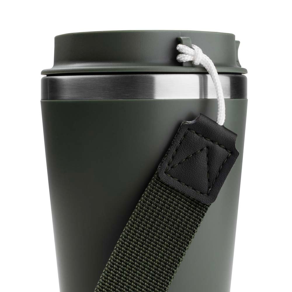 Copo de 350 ml com parede dupla, interior em inox 304 e exterior em plástico PP, tampa em plástico PP, alça de mão e acabamento com pintura fosca.