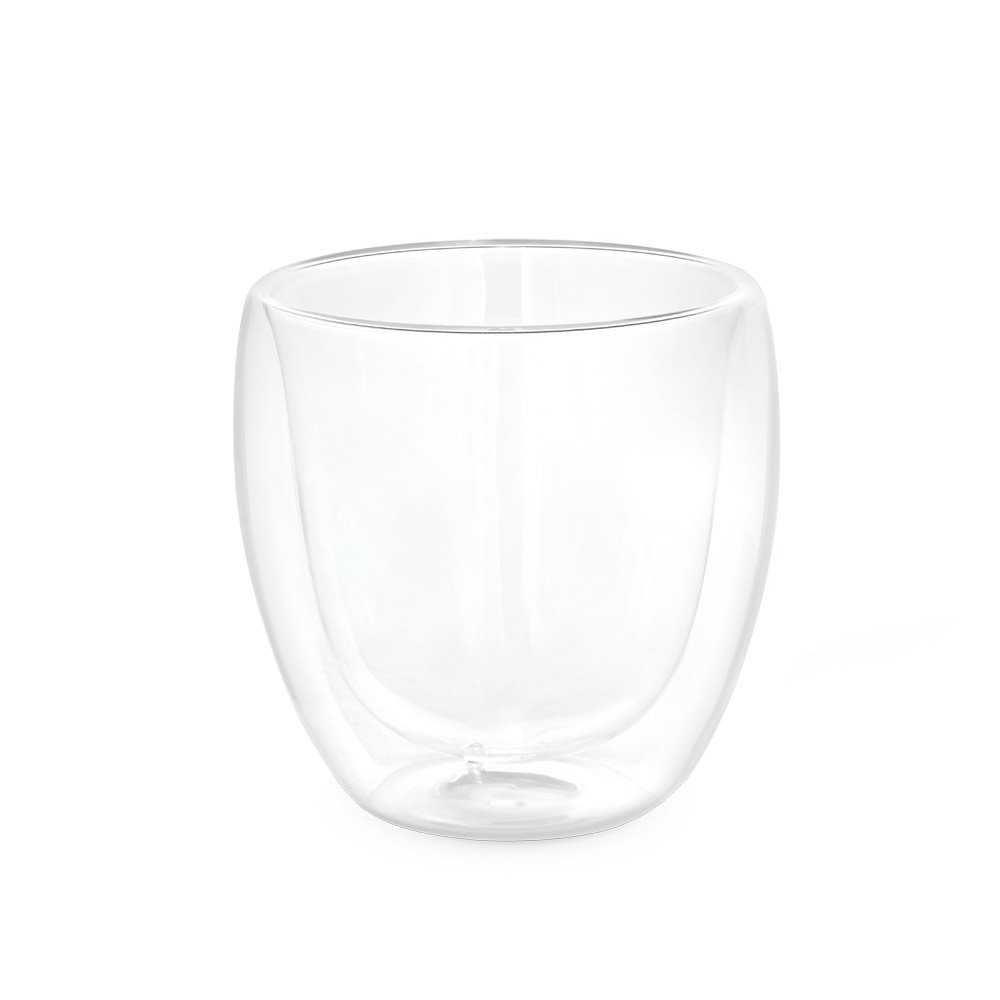 Copo de vidro isotérmico com parede dupla isolada a ar e capacidade até 220 mL. Food grade. Fornecido em caixa de oferta personalizável. ø80 x 86 mm