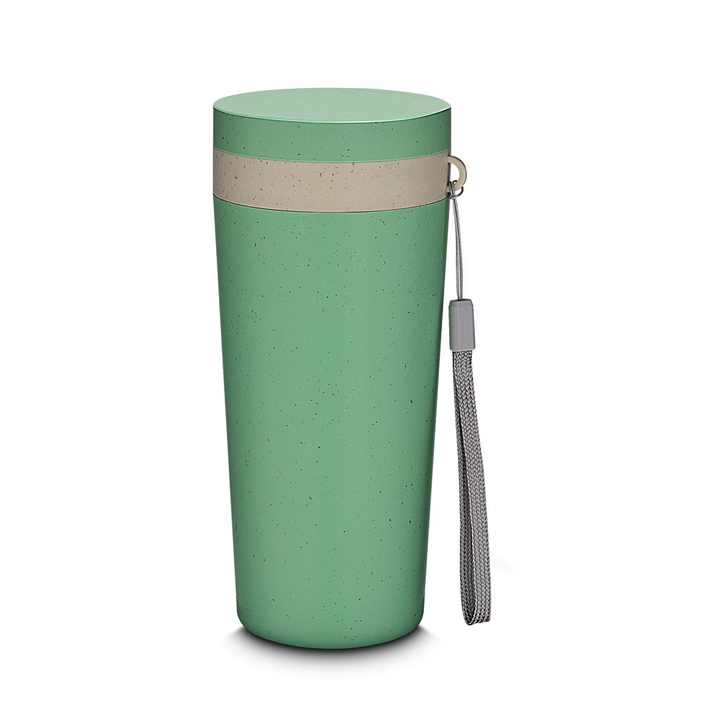 Copo plástico com parede dupla, produzido com fibra de trigo e plástico, com capacidade de 300ml, alça para transporte e tampa rosqueável.