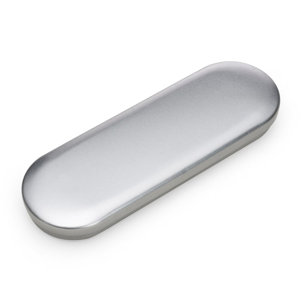 Estojo de metal brilhante para uma ou duas canetas com parte interna revestida de espuma. Imagem meramente ilustrativa,