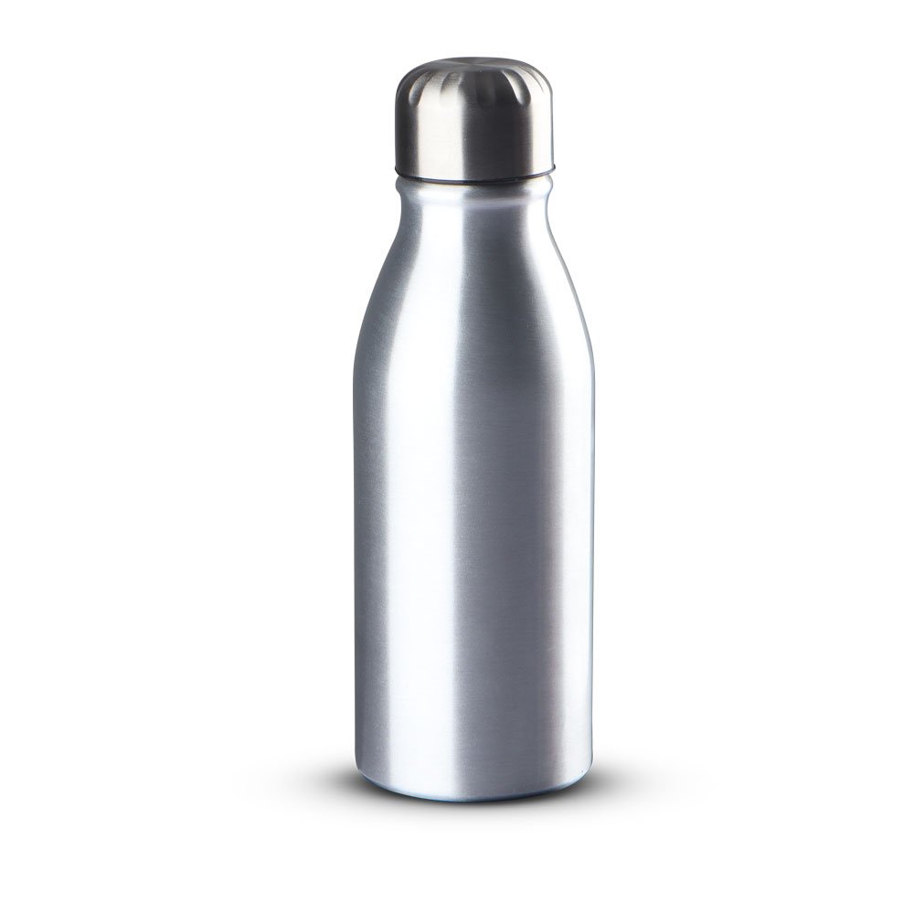 Garrafa em alumínio com tampa em inox e anel de silicone para vedação na tampa. Capacidade 500ml.