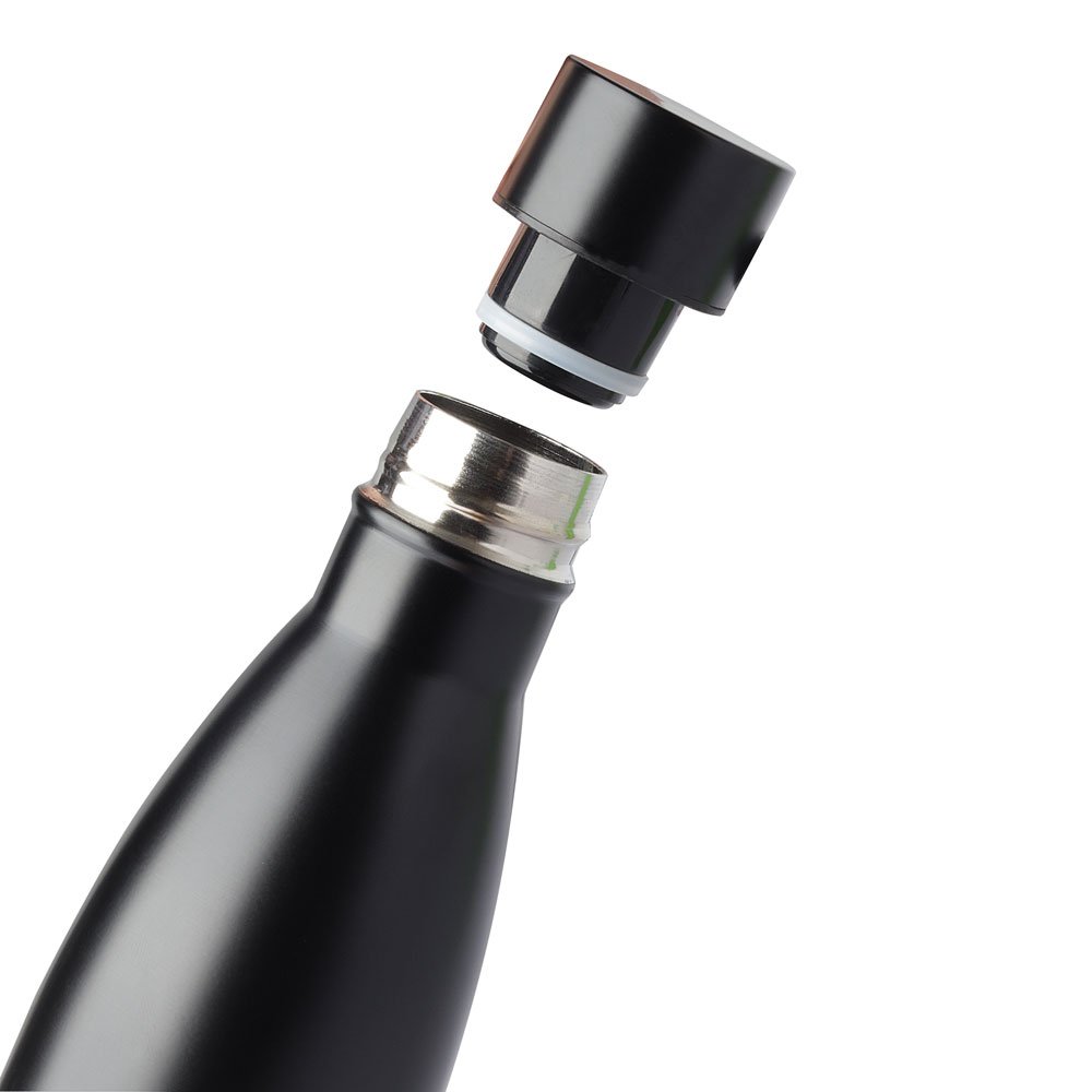 Garrafa térmica em aço inox com parede dupla isolado à vácuo, com tampa de inox na cor do produto e anel de silicone para vedação. Capacidade de até 500ml, pintura fosca.