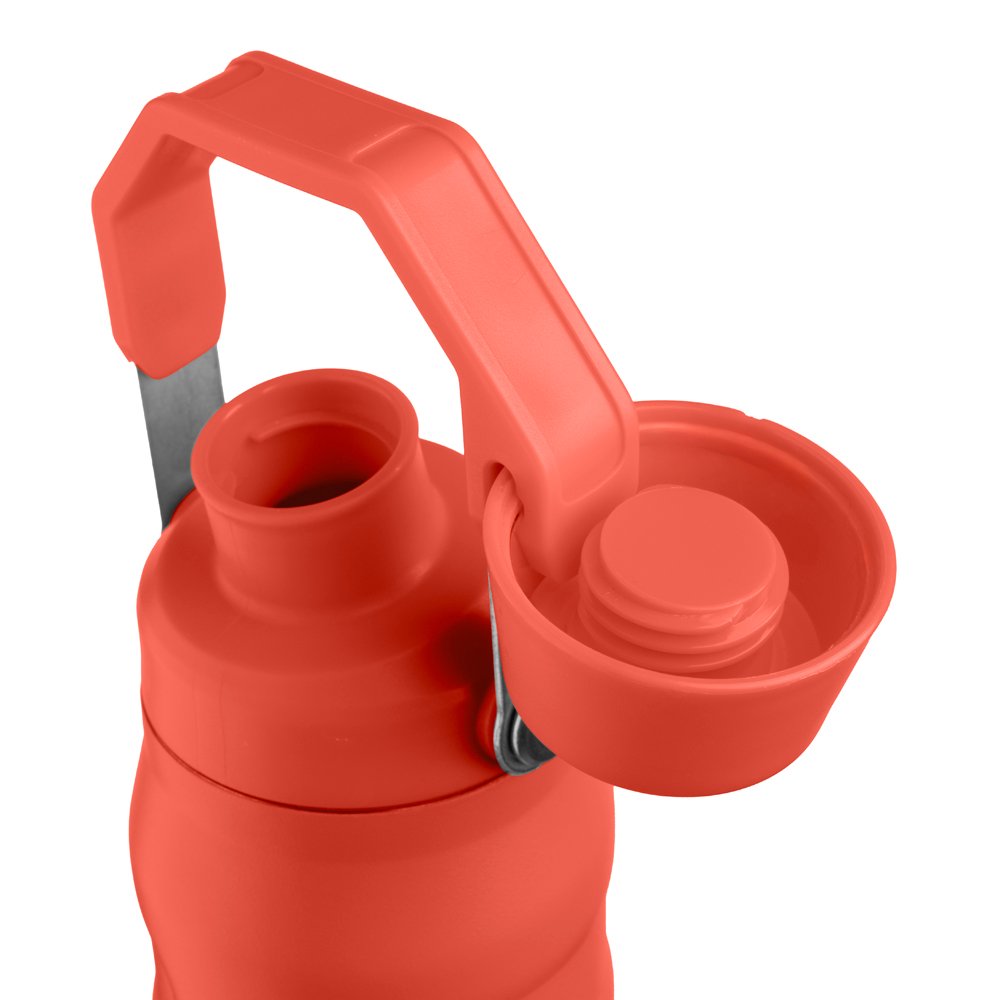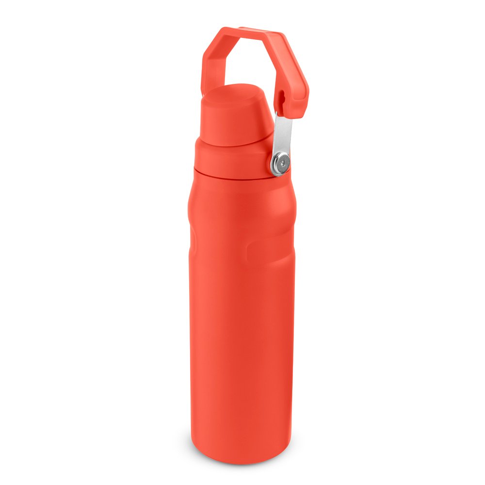 Garrafa térmica de 750 ml com parede dupla em inox (interno 304 / externo 201), pintura a pó e tampa em plástico PP. A tampa é removível e pode ser encaixada na alça.