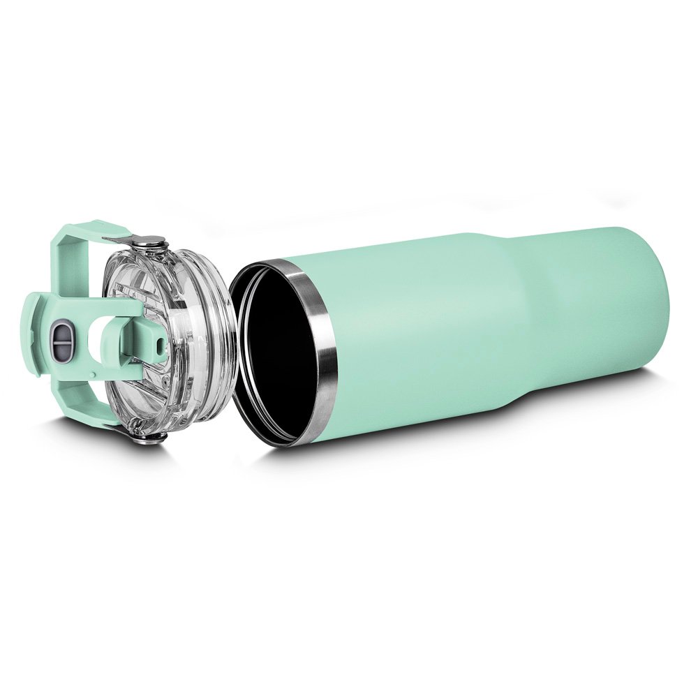 Garrafa térmica em aço inox com parede dupla com capacidade de até 950ml,tampa rosqueável com alça em plástico, permite-se hidratar por canudo ou bico, com anel de silicone para vedação.