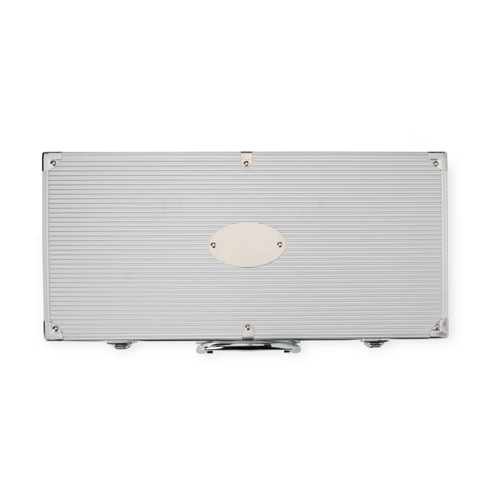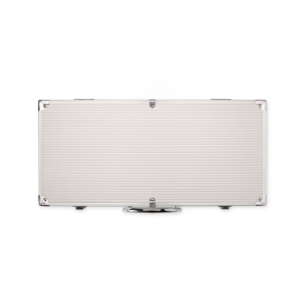 Descrição: Kit churrasco 10 peças em maleta de alumínio com travas de segurança e placa central para personalização. Contém: espátula, pegador, escova para grelha, faca, pincel, garfo e quatro espetos, parte interna da maleta com revestimento em TNT e suportes de velcro para fixação das peças.