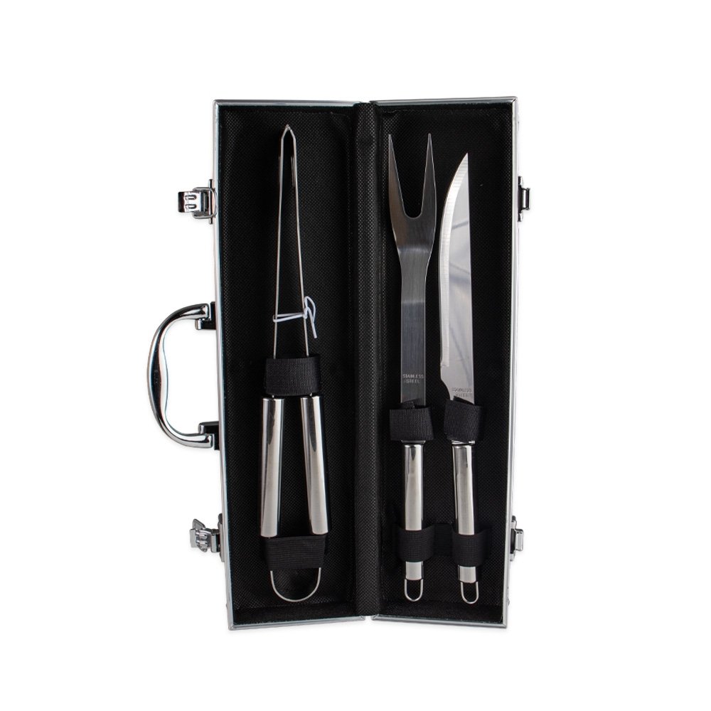 Descrição: Prepare churrascos deliciosos com nosso kit de três peças, ideal para quem busca qualidade e precisão no preparo de carnes e outros alimentos. O conjunto inclui uma pinça, um garfo e uma faca de sete polegadas, acompanhados de uma elegante maleta de alumínio com plaquinha para personalização, garantindo mais exclusividade e organização.