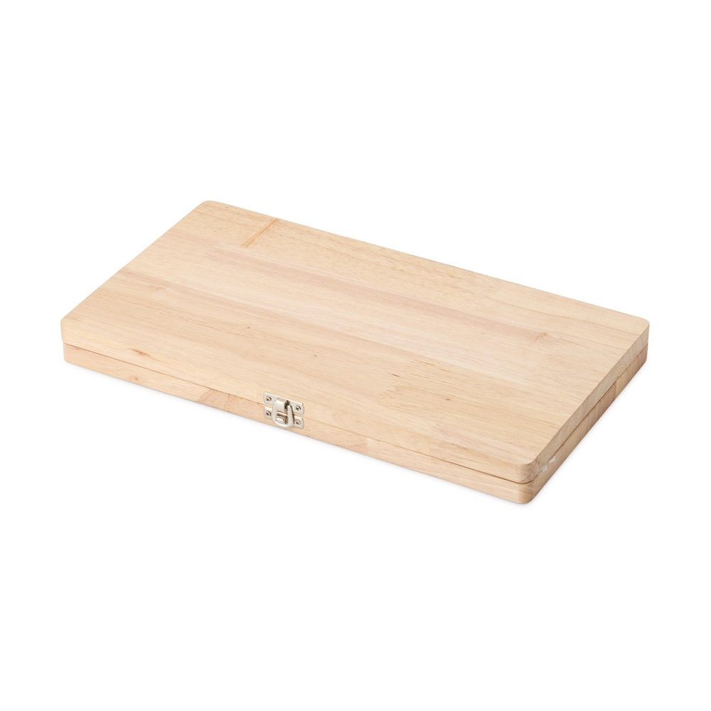 Descrição: Kit churrasco 4 peças em estojo de madeira. Contém três facas e um garfo.