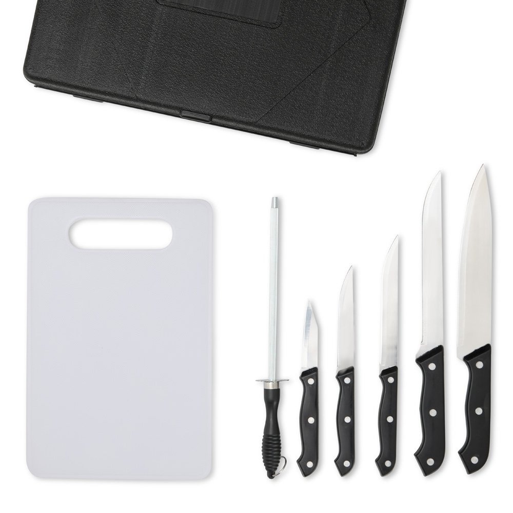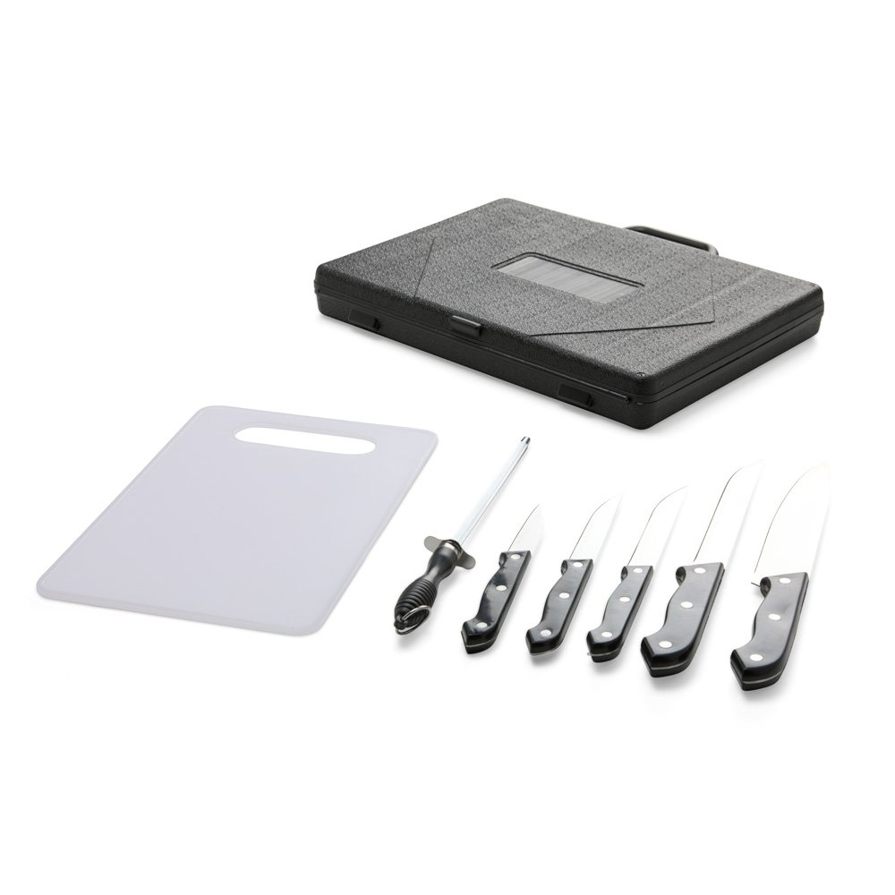 Descrição: Um kit completo para ajudar na preparação de um churrasco inteiro e deixar o momento de confraternização ainda melhor. Este conjunto traz 7 itens, incluindo 1 tábua em plástico, 1 chaira em aço inox, e 5 facas em tamanhos diferentes do mesmo material: 1 faca de legumes (com 3 polegadas de lâmina), 1 faca de cozinha (com lâmina de 4 polegadas), 1 faca de desossar (com lâmina de 5 polegadas), 1 faca trinchante (com lâmina de 7 polegadas) e 1 faca peixeira (com lâmina de 8 polegadas). Tudo isso acompanhada por uma elegante maleta para facilitar a organização e o transporte do kit.