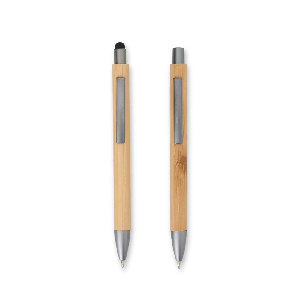 Descrição: Nosso Kit Ecológico de Caneta e Lapiseira de Bambu é excelente para quem busca um toque sustentável no dia a dia. A lapiseira possui acionamento por clique, e a caneta conta com carga esferográfica azul de 1.0mm e função touch para quem precisa de toques precisos em dispositivos. Além disso, acompanha uma embalagem que imita bambu. Uma ótima escolha para presentes corporativos ou para quem ama escrever sem abrir mão da consciência ecológica!
