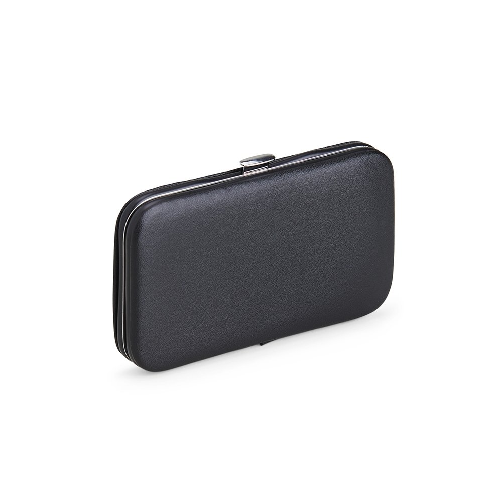 Descrição: Kit manicure 7 peças em estojo de couro sintético. Possui: dois cortadores de unhas, tesoura, lixa, pinça, empurrador de cutícula e palito de unha. Parte interna de TNT com suporte de couro sintético para fixar as peças. Para abrir o estojo basta apertar o botão central.