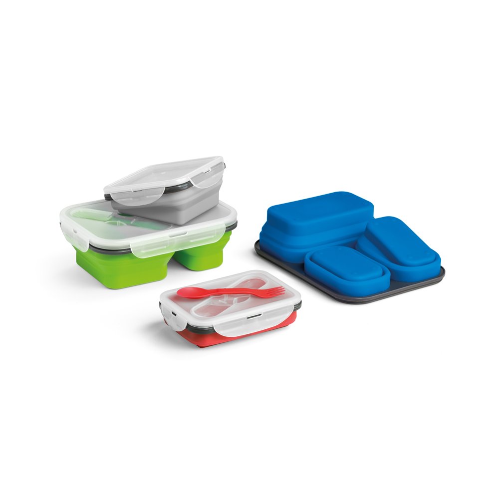 Marmita retrátil. Silicone e PP. Com 1 compartimento e talher 2 em 1 (garfo e colher).